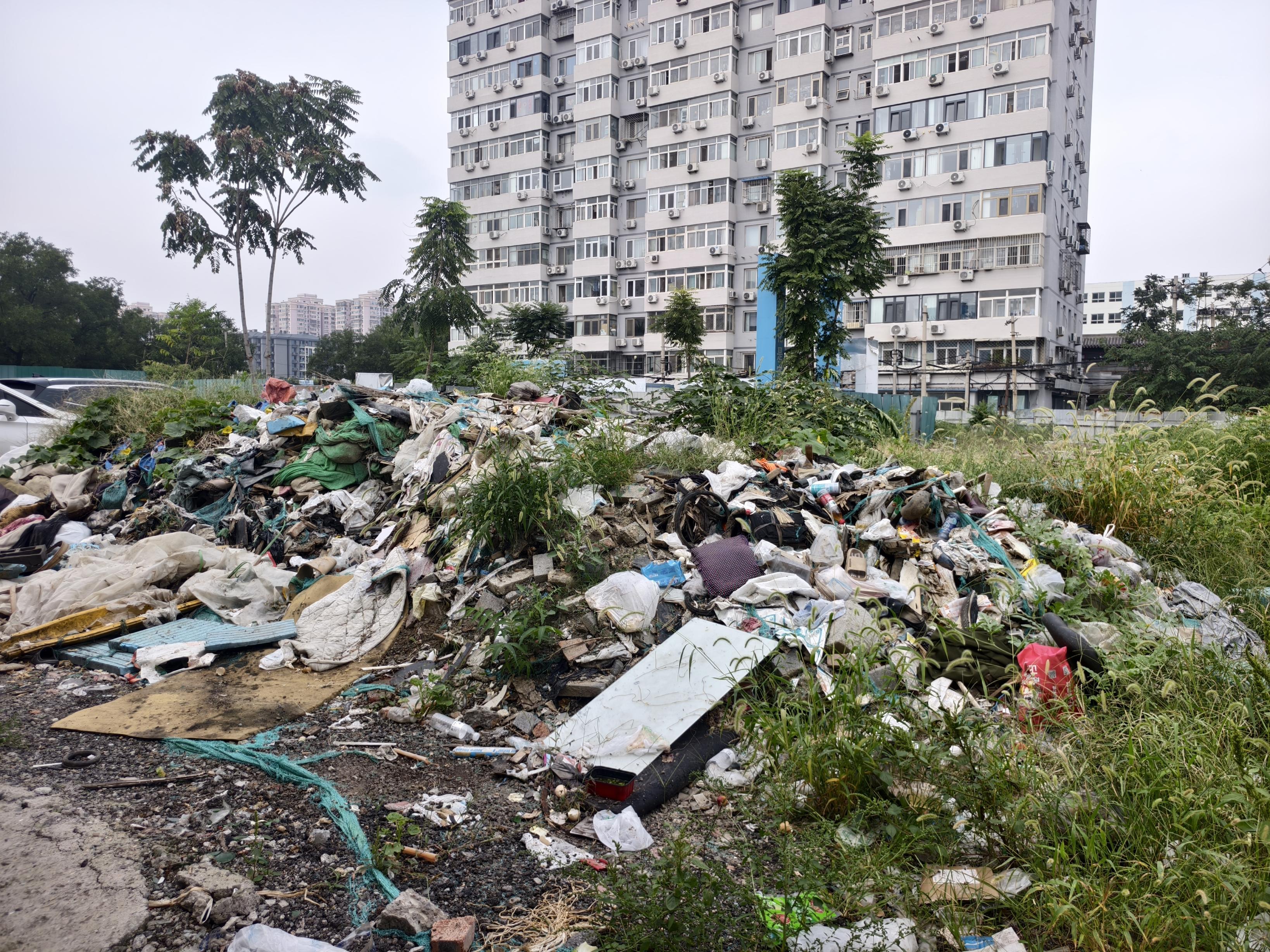9月13日记者在现场看到,安乐林路91号院旁有一排两层集装箱式活动房,后边有一大片空地,入口处是一座临时垃圾站,十余辆环卫车正等着将垃圾清运到站内。垃圾站内相对整洁,并无垃圾散落或胡乱堆放。可顺着垃圾站往里走还有一片空地,这里的观感就十分糟糕了。空地上停着七八辆车,半人多高的杂草丛里堆放着各种垃圾,塑料袋、快递盒、抱枕、海绵垫……垃圾堆上,成群的苍蝇飞舞,臭味阵阵散发。再往里走,是两间拆了一半的房屋,墙壁之间还散落着砖块等建筑垃圾,集装箱活动房旁的大树周边垃圾也不少,泡沫箱、铁桶等也堆成了山。