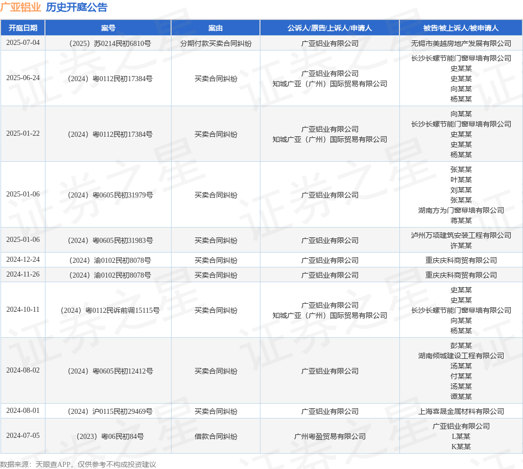 案号:(2024)粤0112民初17384号审理法院:广州市黄埔区人民法院案由:买卖合同纠纷当事人信息: 原告/上诉人:广亚铝业有限公司、知城广亚(广州)国际贸易有限公司 被告/被上诉人:长沙长螺节能门窗幕墙有限公司、史某某、史某某、向某某、杨某某开庭日期:2025年6月24日根据统计,近一年内以广亚铝业有限公司为当事人的历史开庭公告有11则,其中案由为“买卖合同纠纷”的公告以9则居首,其次为“借款合同纠纷”有1则,“分期付款买卖合同纠纷”有1则。历史开庭公告如下: